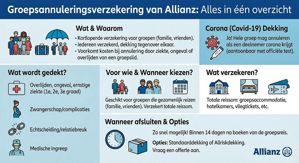 Een kortlopende groepsannuleringsverzekering van Allianz is raadzaam als je met een groep op reis gaat (familie, vrienden of een gezelschap). En je wilt annuleren als iemand uit de groep komt te overlijden, een ongeval of ernstige ziekte krijgt. Er is dus dekking tegenover elkaar en iedereen is in 1 keer verzekerd.