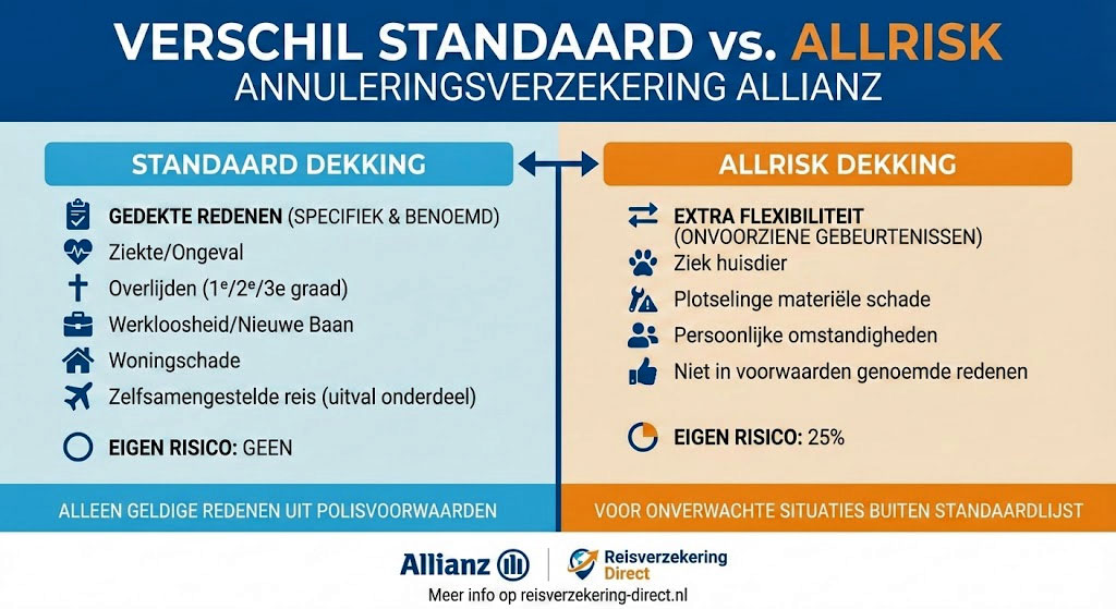 - Met de allriskdekking kunnen groepsleden annuleren om redenen die normaal niet gedekt zijn, met 100% vergoeding als de reden in de overeenkomst staat of 75% vergoeding bij een niet genoemde reden.