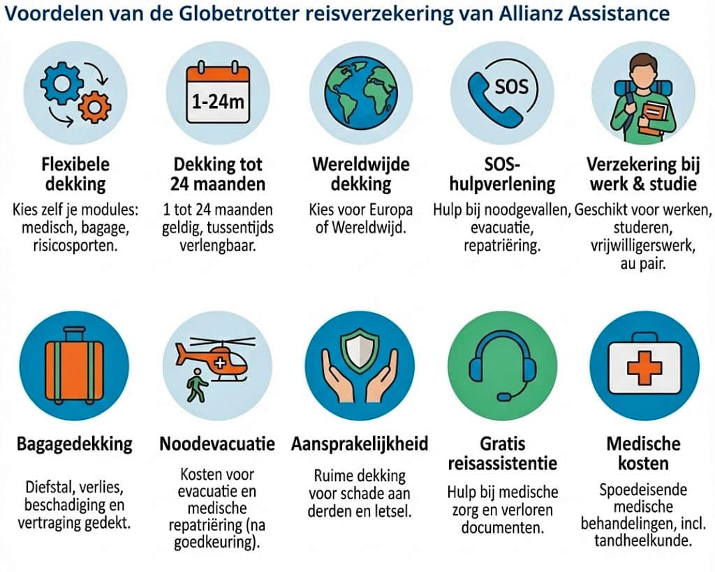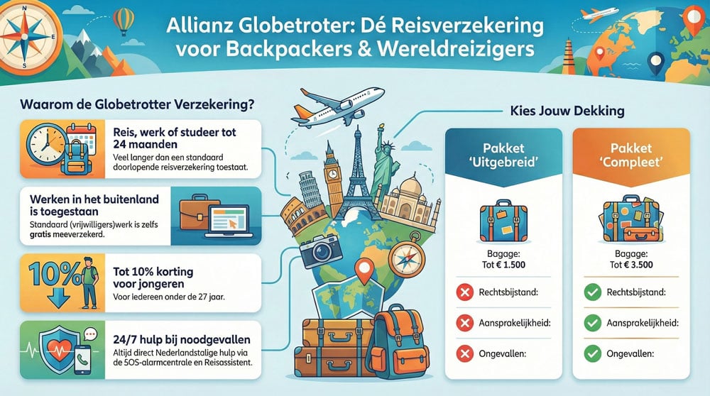 De backpacker reisverzekering in het kort: de Globetrotter Verzekering van Allianz is een gespecialiseerde reisverzekering voor o.a. backpackers die voor een langere periode, tot wel twee jaar, naar het buitenland gaan. In tegenstelling tot standaardpolissen biedt deze verzekering volledige dekking voor backpacken, studeren en werken, waarbij zelfs risicovolle beroepen tegen een toeslag kunnen worden meeverzekerd. Backpackers kunnen kiezen uit verschillende pakketten voor bagage en medische kosten, wat belangrijk is voor reizigers die hun Nederlandse zorgverzekering tijdelijk stopzetten.