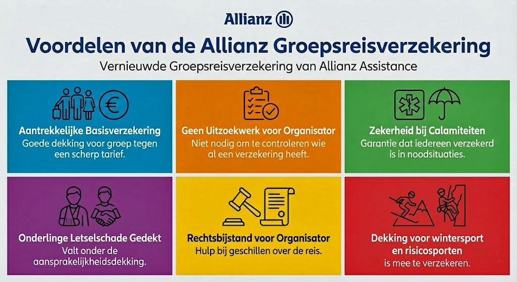- De Allianz Groepsreisverzekering biedt dekking vanaf €0,34 per persoon per dag, inclusief medische kosten en rechtsbijstand.