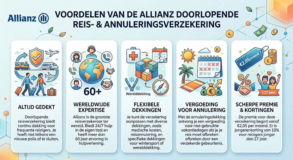 - Een Allianz doorlopende reis- en annuleringsverzekering biedt continu dekking voor frequente reizigers, waardoor je niet telkens een nieuwe polis hoeft af te sluiten.