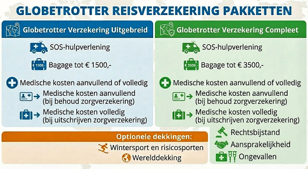 - Kies tussen twee pakketten: Globetrotter Verzekering Uitgebreid en Compleet, met de mogelijkheid voor werelddekking.