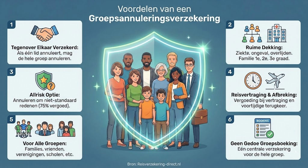 - Een groepsannuleringsverzekering biedt dekking voor annuleringskosten als een groepslid om ernstige redenen zoals ziekte of overlijden moet annuleren.