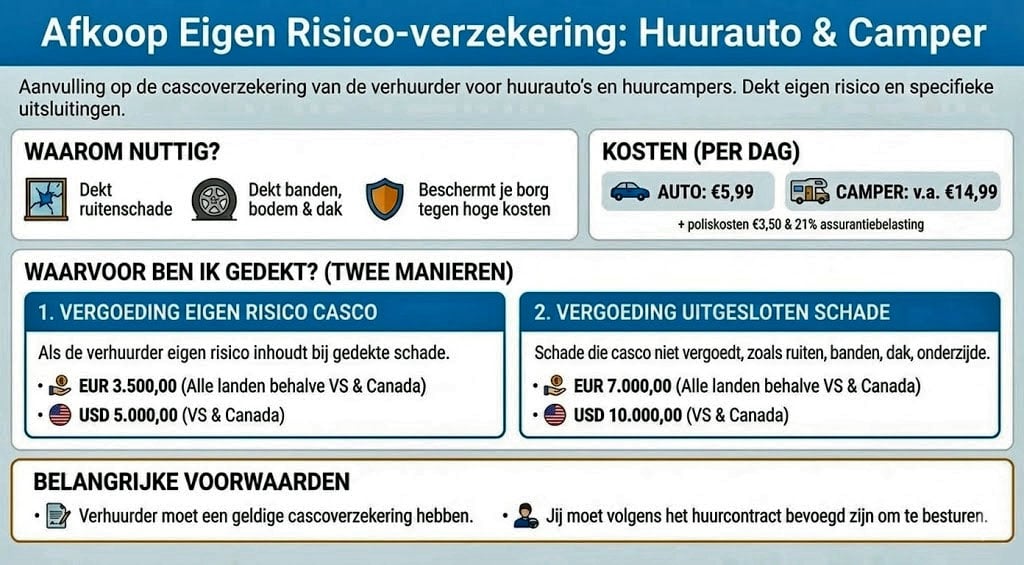 - Vergoeding van het eigen risico: Mocht je schade rijden met de huurauto of camper, dan brengt de verhuurder eerst het eigen risico in rekening. Deze verzekering vergoedt dat bedrag aan jou, zodat je zelf niet voor de kosten opdraait.