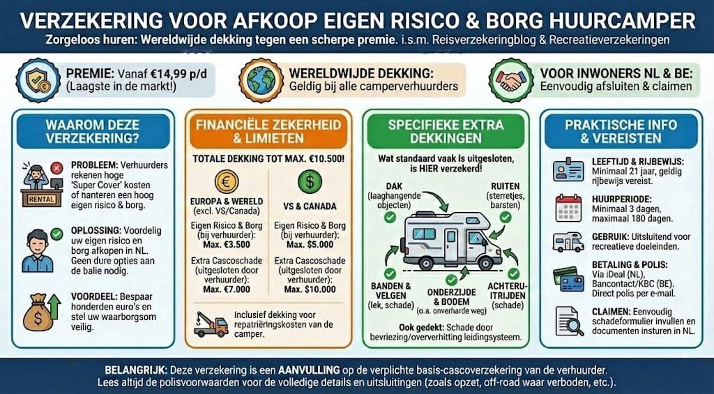 Ja, dit is een van de grote voordelen van deze polis. Verhuurbedrijven sluiten schade aan ruiten, banden, de onderkant of het dak van de camper vaak uit van hun eigen verzekering, waardoor jij voor de volledige kosten opdraait. Deze Afkoop Eigen Risico Verzekering biedt hier wel dekking voor, zolang de schade maar van de borg wordt ingehouden of als eigen risico wordt belast.