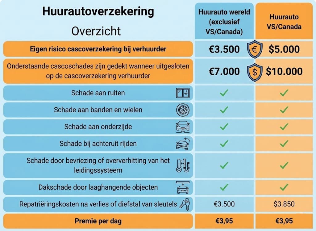 – CDW (Collision Damage Waiver): vergelijkbaar met de cascoverzekering. De CDW beperkt de aansprakelijkheid voor schade aan het gehuurde voertuig.