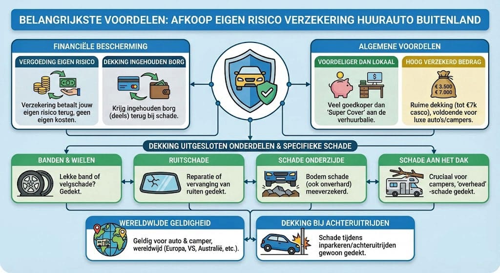 Ja, dit is een van de grootste voordelen van deze polis. Verhuurders sluiten schade aan banden, wielen, ruiten, de onderzijde van het voertuig en het dak vaak uit van hun eigen afkoopregelingen (de ‘exclusions’). Deze verzekering dekt die kosten wel. Ook schade ontstaan bij achteruitrijden en schade door gebruik op onverharde wegen (mits dit met het voertuig is toegestaan) is meeverzekerd.