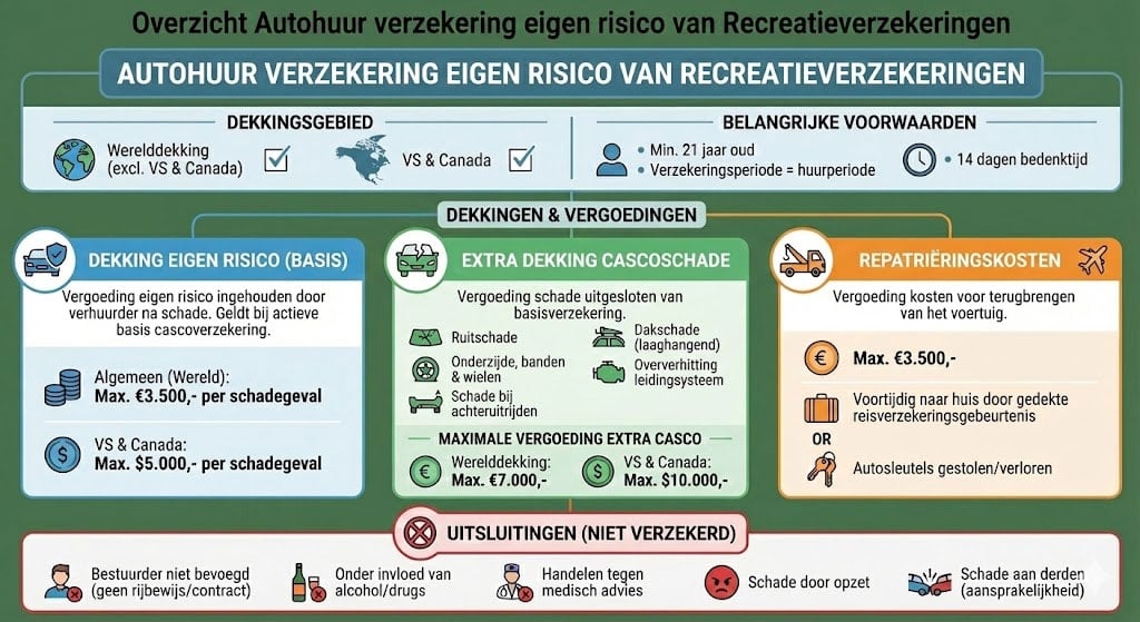 ✓ Verder biedt de verzekering een aanvullende cascoschadedekking. Deze geldt voor schadeoorzaken die in de standaard cascoverzekering van het gehuurde voertuig zijn uitgesloten.
