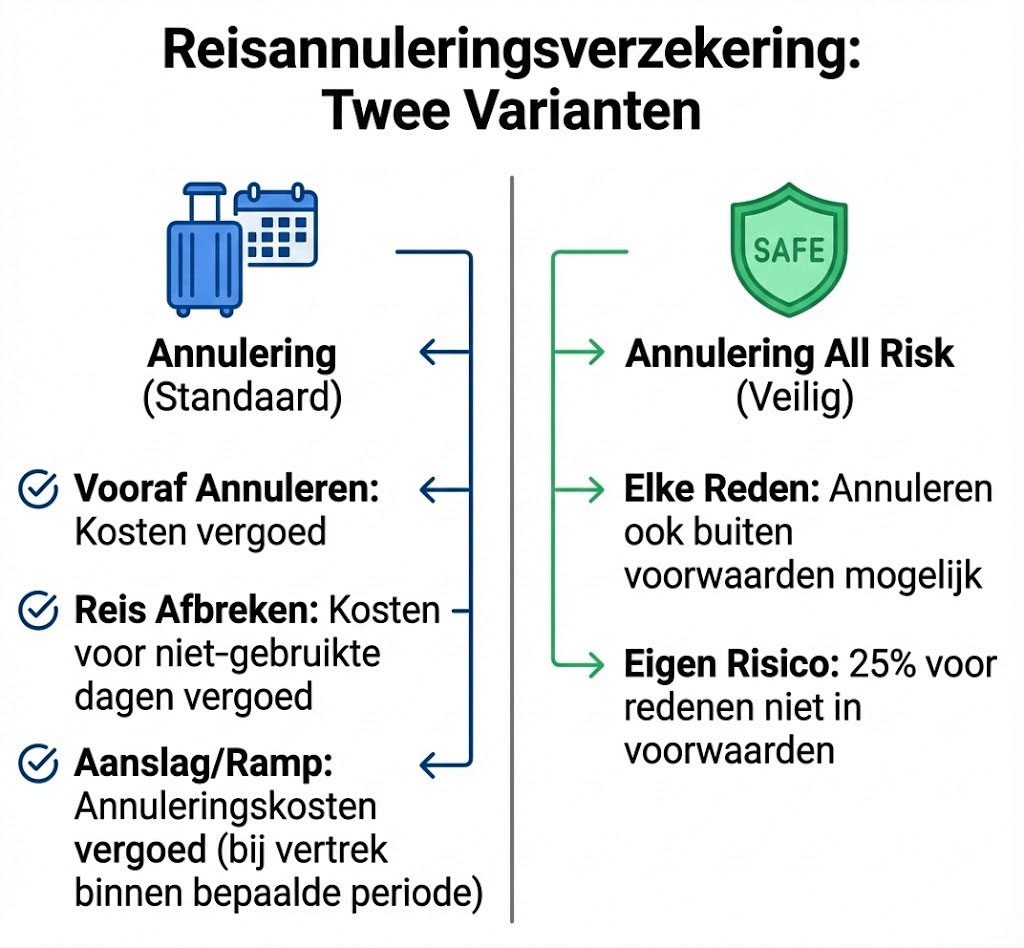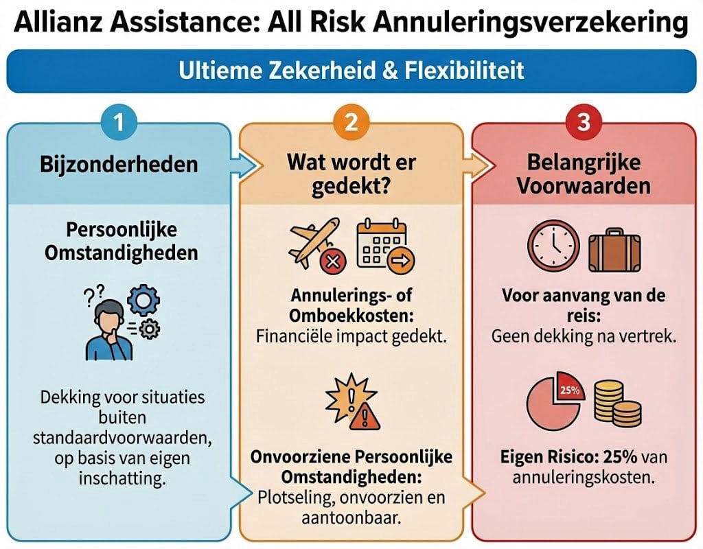De All Risk Annuleringsverzekering van Allianz Assistance gaat verder dan de standaard annuleringsverzekering. Waar de standaarddekking alleen geldt bij specifieke gebeurtenissen zoals ziekte of een sterfgeval, biedt de All Risk verzekering ook bescherming bij persoonlijke omstandigheden die niet in de standaardvoorwaarden vallen. Denk aan situaties waarin je eigen inschatting of persoonlijke reden je reis onmogelijk maakt.