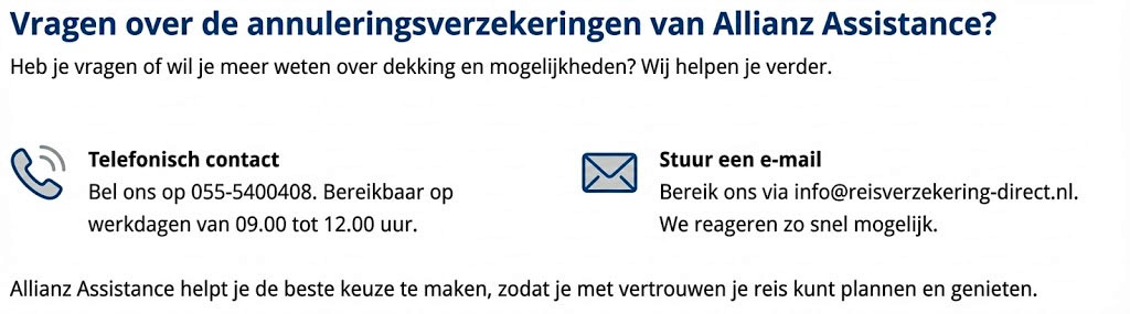 Met Allianz Assistance reis je met de zekerheid van een partner die met je meedenkt, ook als het even tegenzit. Een vakantie moet een moment van ontspanning en plezier zijn, niet van zorgen over onverwachte situaties of kosten. Allianz Assistance begrijpt dat een reis vaak meer betekent dan een ticket en een koffer. Het is een investering in waardevolle tijd, ervaringen en herinneringen. Daarom biedt Allianz Assistance reisverzekeringen en annuleringsverzekeringen die je beschermen tegen onverwachte gebeurtenissen, zodat je zorgeloos kunt genieten van je reis, ongeacht waar je naartoe gaat.