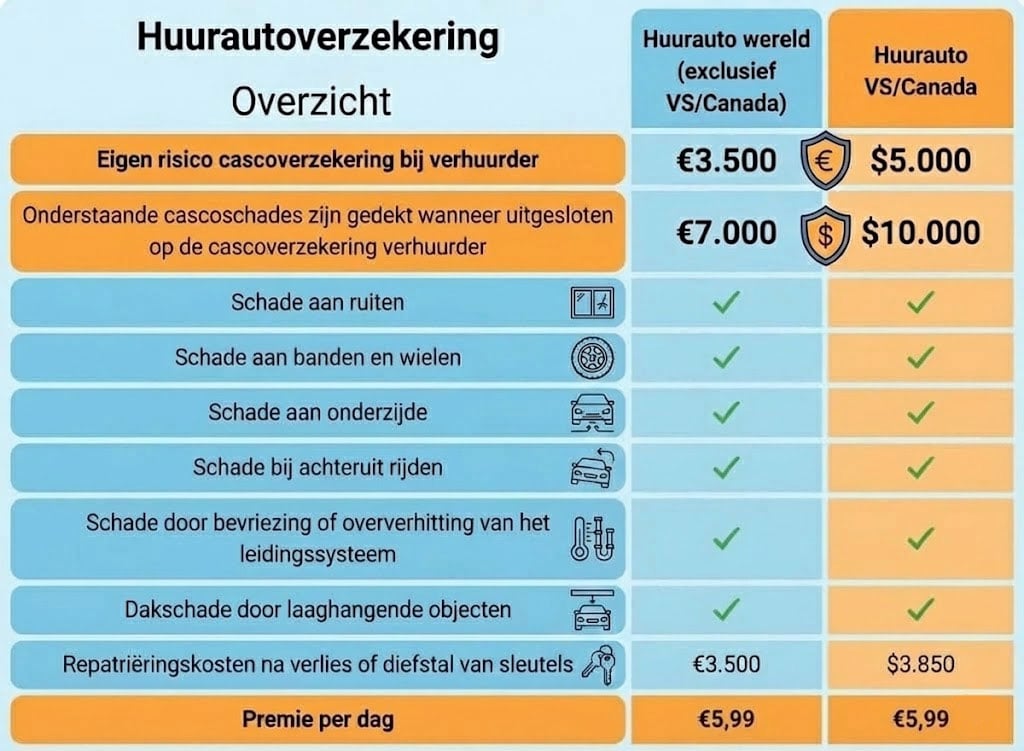Wanneer je een auto huurt, ben je meestal standaard verzekerd voor wettelijke aansprakelijkheid en cascoschade. Toch blijft er vrijwel altijd een aanzienlijk eigen risico over dat je zelf moet betalen bij schade of diefstal. Deze verzekering vergoedt dat bedrag volledig tot een maximum van €3.500 per huurcontract. In de Verenigde Staten en Canada loopt dit bedrag zelfs op tot $5.000. En voor specifieke cascoschades biedt de polis een aanvullende dekking tot maar liefst € 7.000 (of $ 10.000 in Noord-Amerika).