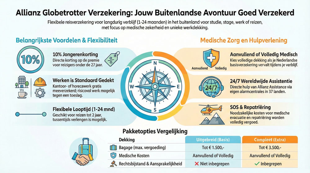 Met de Allianz Globetrotter Verzekering wordt een langdurig verblijf in het buitenland een zorgeloze ervaring. Of het nu gaat om werken, studeren of reizen, deze verzekering biedt uitgebreide dekking, zodat niets een onvergetelijk avontuur in de weg staat.