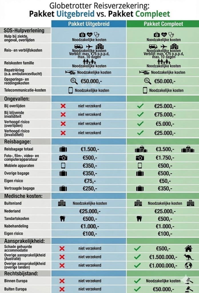 - Globetrotter Verzekering Compleet: de meest uitgebreide dekking, voor maximale zekerheid tijdens jouw reizen.