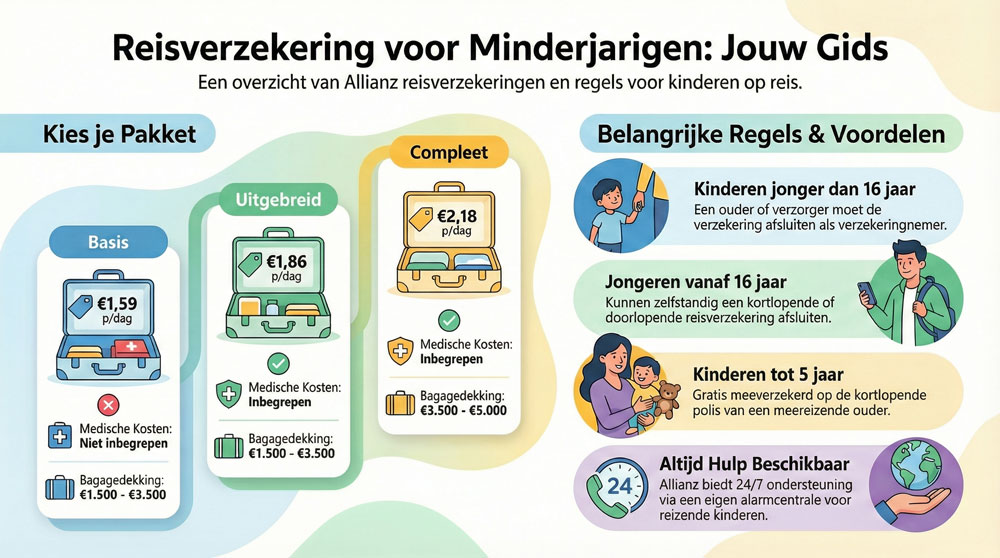 - Kinderen boven de 16 jaar kunnen wel zelfstandig een reisverzekering afsluiten bij Allianz Assistance.